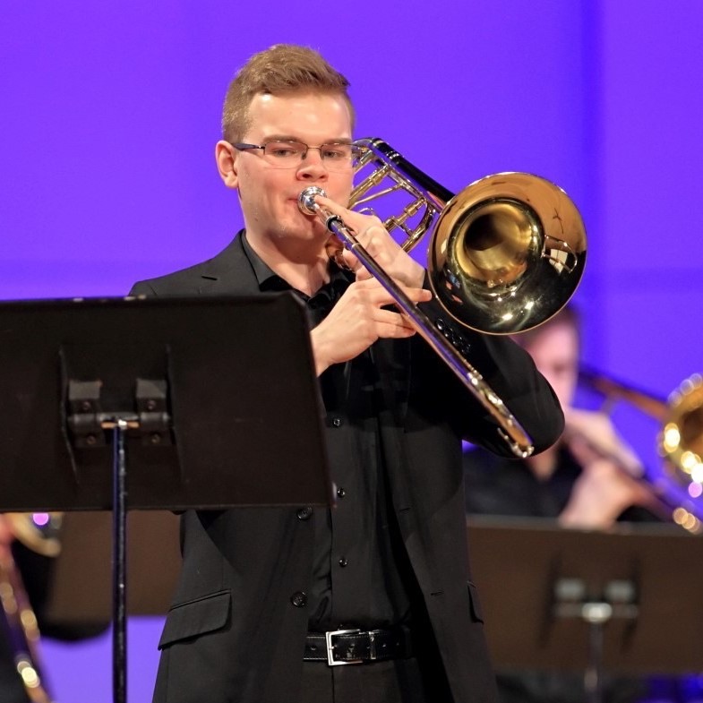 While he was a student at JMU, he performed with the Symphony Orchestra, Wind Symphony, and Trombone Choir, and at FSU, he performed with the Wind Orchestra, Trombone Choir, and Trombone Octet. At both institutions, he was a member of several chamber groups including brass trios, quartets, and quintets. As a performer, he also champions new music, frequently performing in large ensembles created to perform student compositions. Recently, he premiered a work for trombone and fixed media by Ky Nam Nguyen entitled, "When Human Dares Not Speak" (2024).