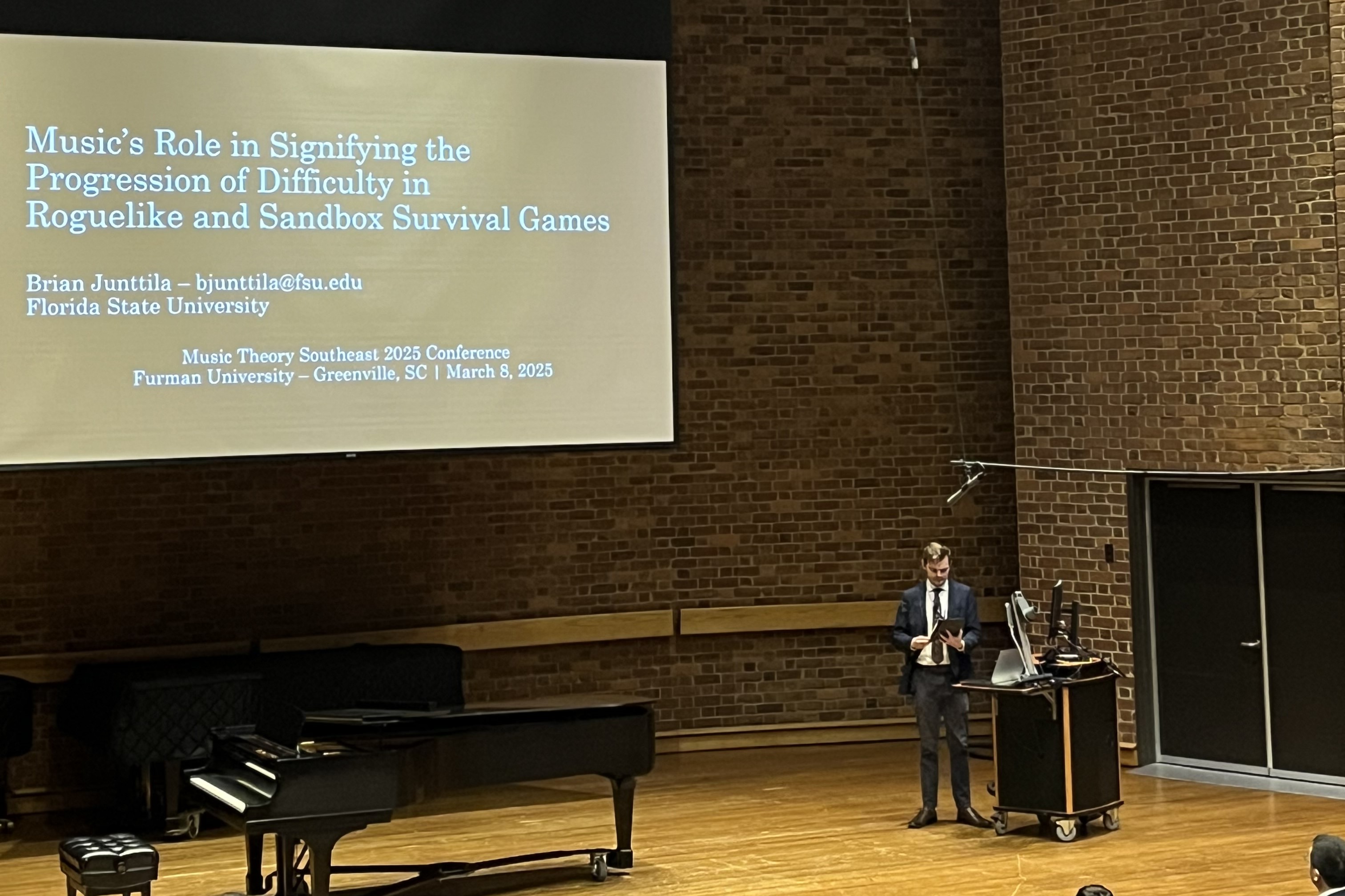 Since Brian returned to FSU in 2023, he has been spending serious focus on music theory and analysis, presenting recently at the Music Theory of the Mid-Atlantic and Music Theory Southeast 2025 Conferences with his paper, "Music's Role in Signifying the Progression of Difficulty in Sandbox and Roguelike Survival Games." He has also been actively conducting and recording, assisting in both roles with several new music performances, including the Polymorphia New Music Ensemble, New Music for Brass Quintet performance, and several recitals.